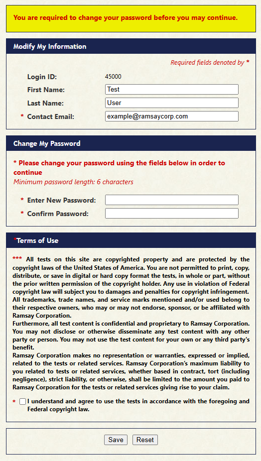 You will then be redirected to the first time login page. You are required to change your password the first time you login. Be sure to read the copyright agreement and check the applicable box. When you are all done click "Save."